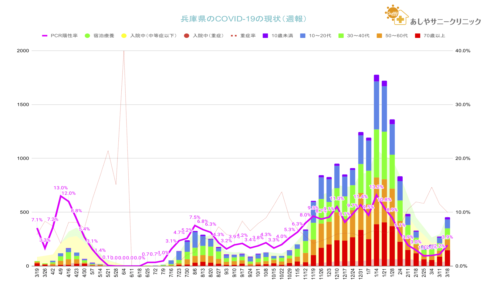 あしやサニークリニック内科は宿泊療養のオンコール医(宿泊療養中の患者さんの容態変化の際に、ナースから問い合わせを受けて指示する業務です)をしていますが、療養者数はやはりこの2週間で倍増しています。