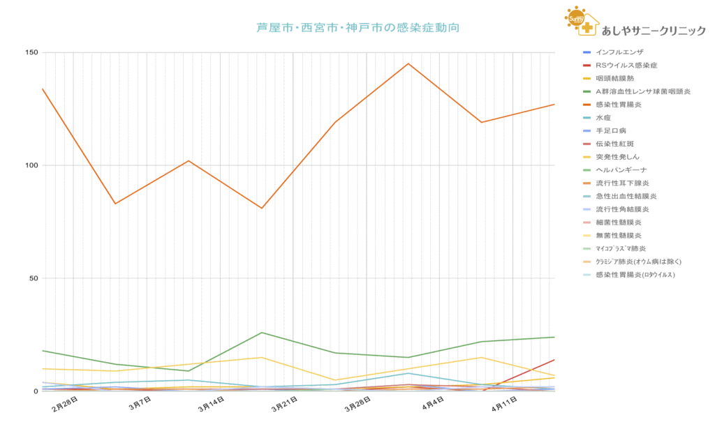 急性胃腸炎は増減を繰り返しながら高めの水準を維持中で、RSウイルス感染症が国内の他のエリアと同様に増加傾向を認めます。乳児のはなみず+咳にご留意下さい。