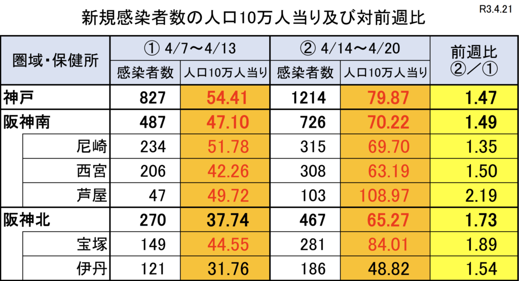 人口10万人あたりの新規感染者数は神戸・阪神南エリアとも高水準です。