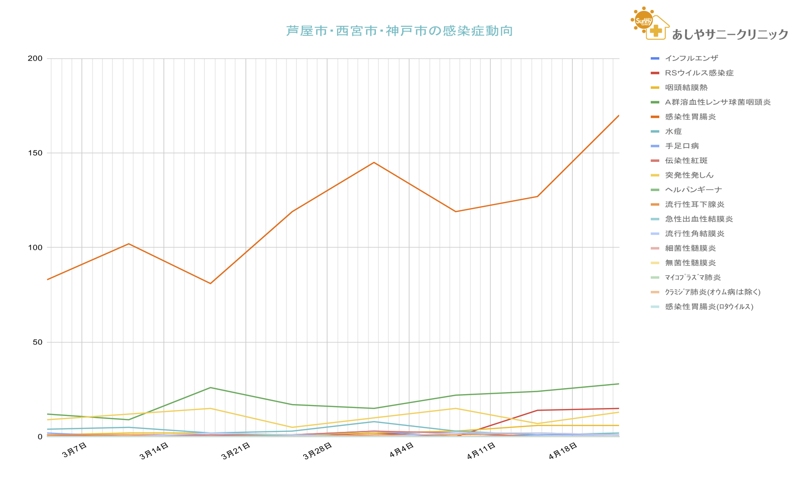 急性胃腸炎は増減を繰り返しながらゆっくりと増加傾向です。RSウイルス感染症は横ばい、溶連菌性咽頭炎はやや高めを維持中です。