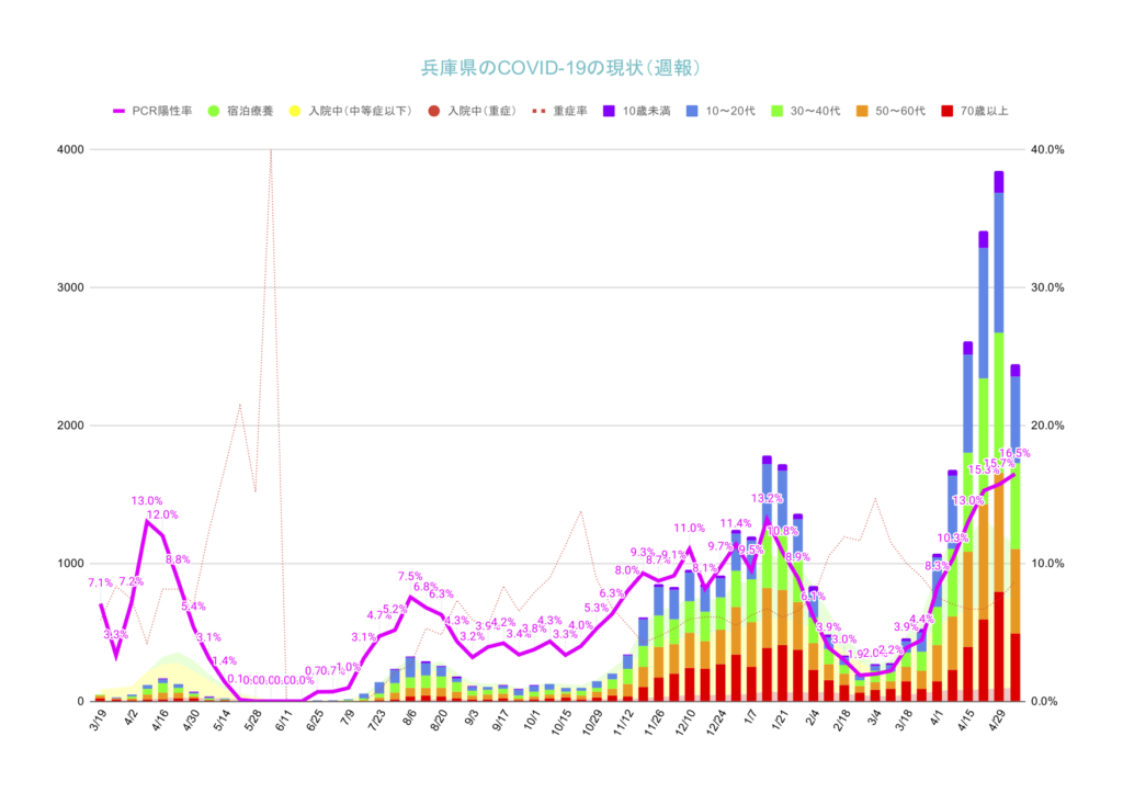 今週はGWで一般感染症に関するアップデートはありません。兵庫県のCOVID-19関連のデータを集計したものを配信しています。
