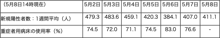 先週増加スピードの鈍化の兆しの可能性を指摘しましたが、5/8時点でのPCR検査の新規陽性者数(1週間平均)は1週間で⊿-59人と減少に転じています。