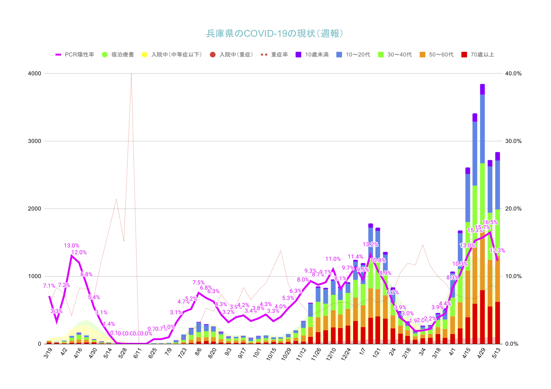 グラフ上もGW分を差し引いてもピークを超えた様に見えます。PCR陽性率が大きく低下しました。