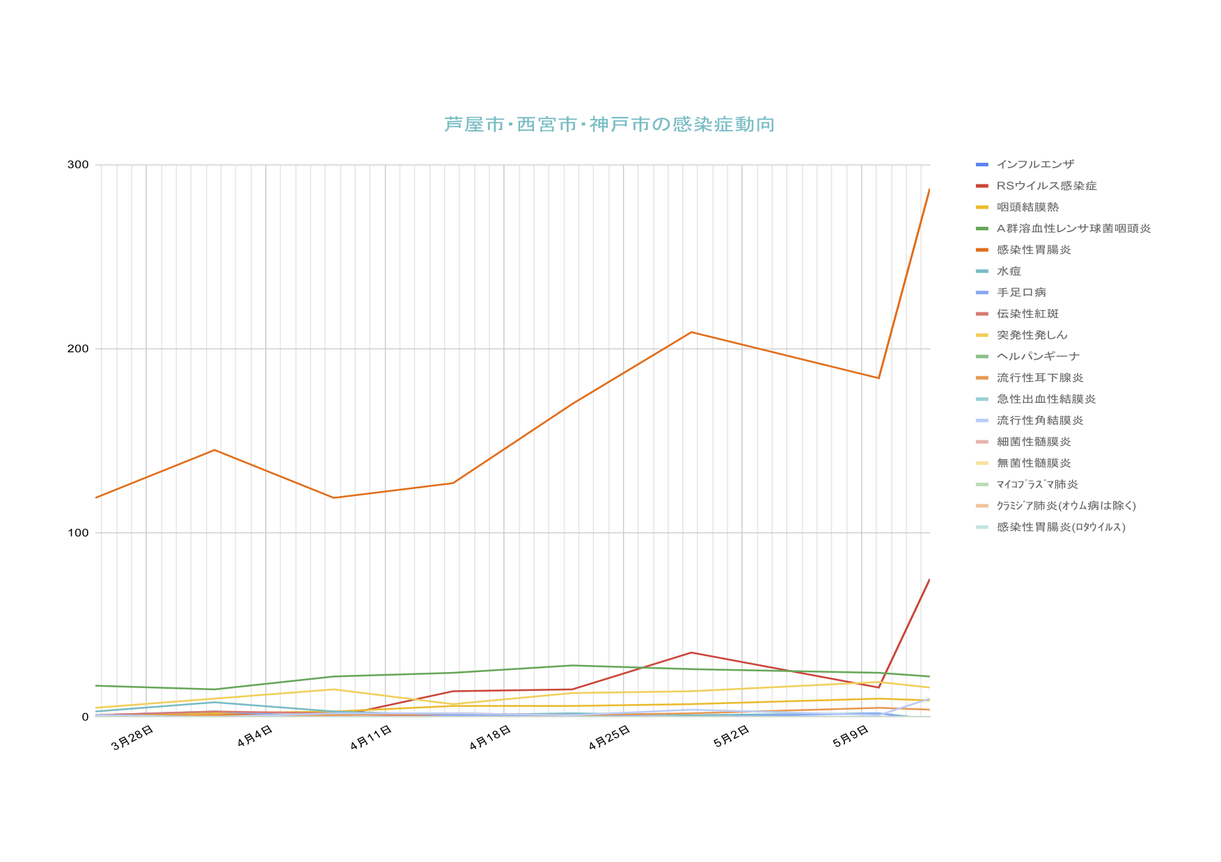 急性胃腸炎・RSウイルス感染症とも急増しているように見えますが、前回報告がGWで少なかったからと思われ、実際は3〜4週間コンスタントに増加しているものと考えられます。