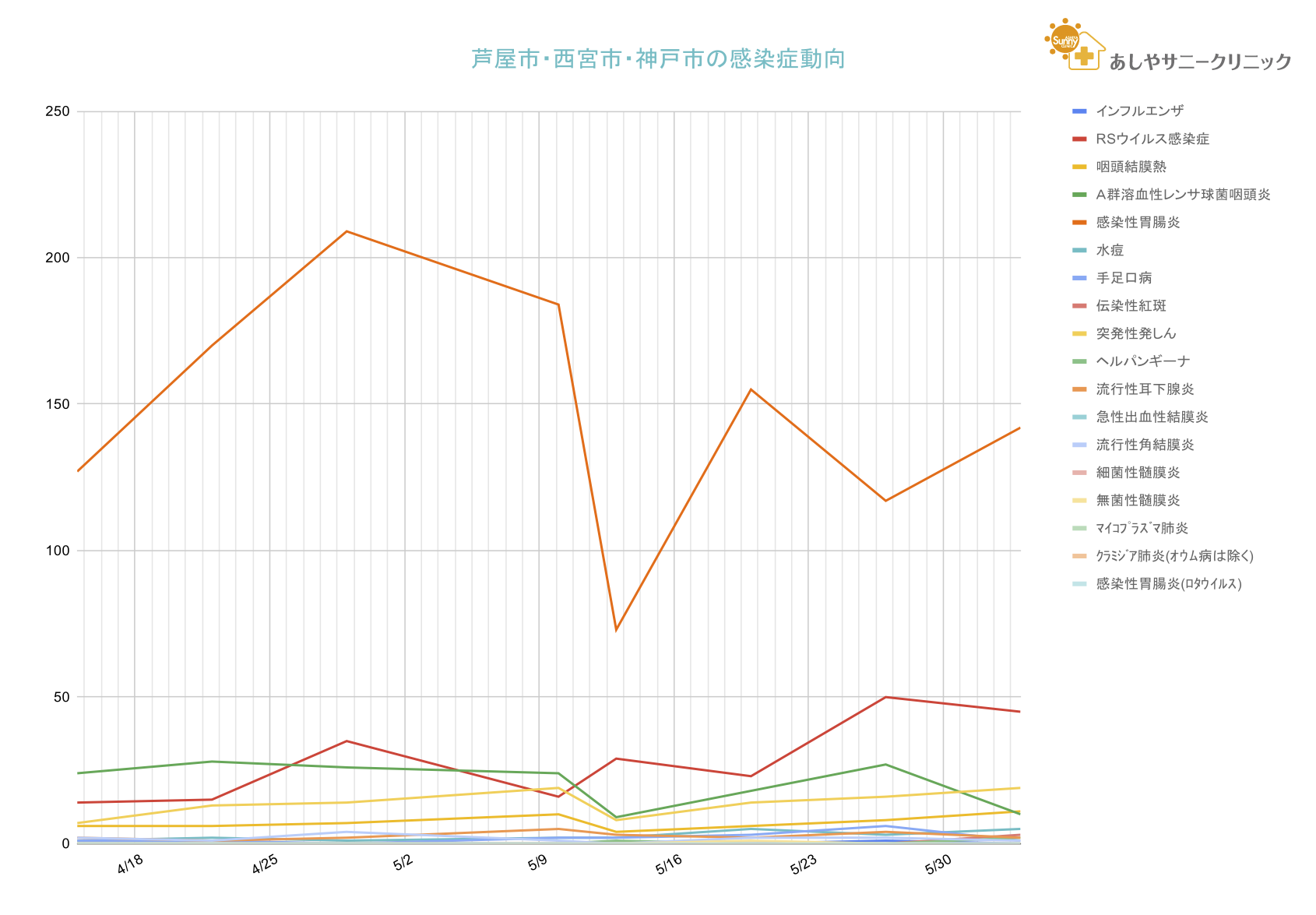 急性胃腸炎は横ばいの小康状態で、RSウイルス感染症も先週から大きく変化していません。