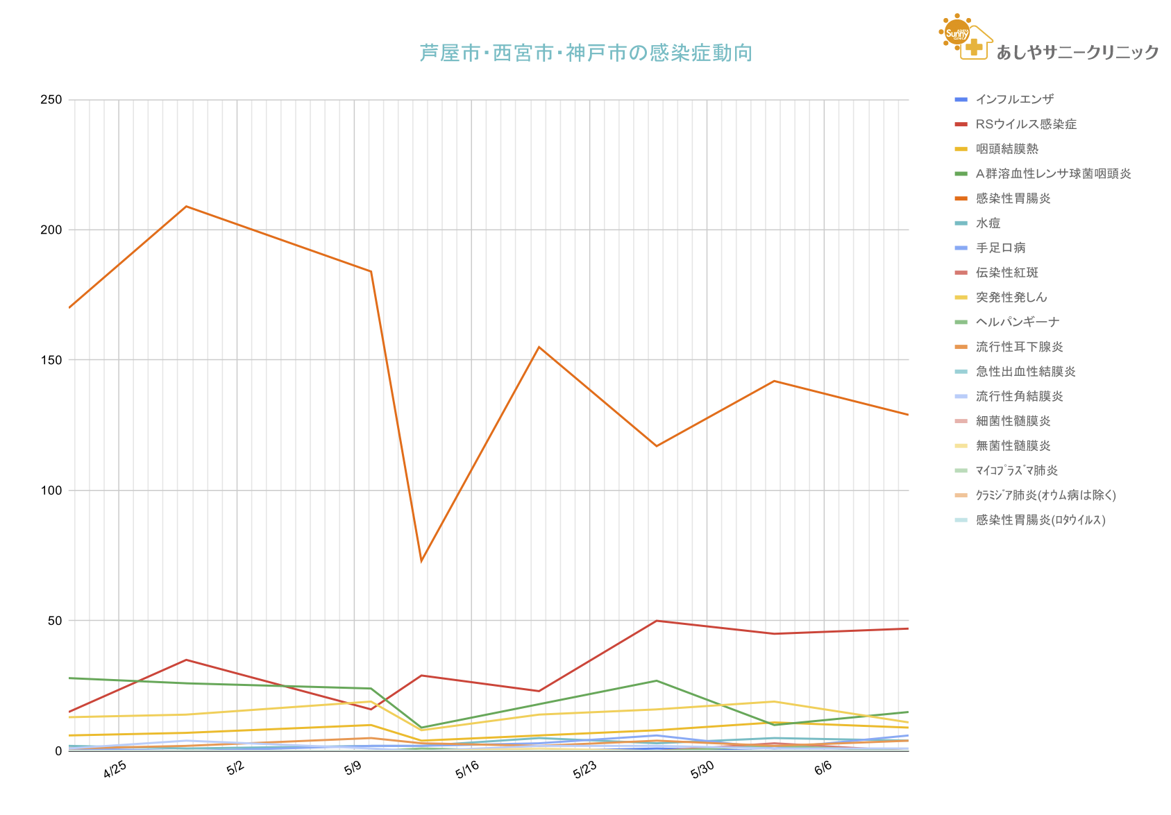 今週はなぜか8日間集計ですが、急性胃腸炎・RSウイルス感染症とも概ね横ばいで大きな変化はありません。