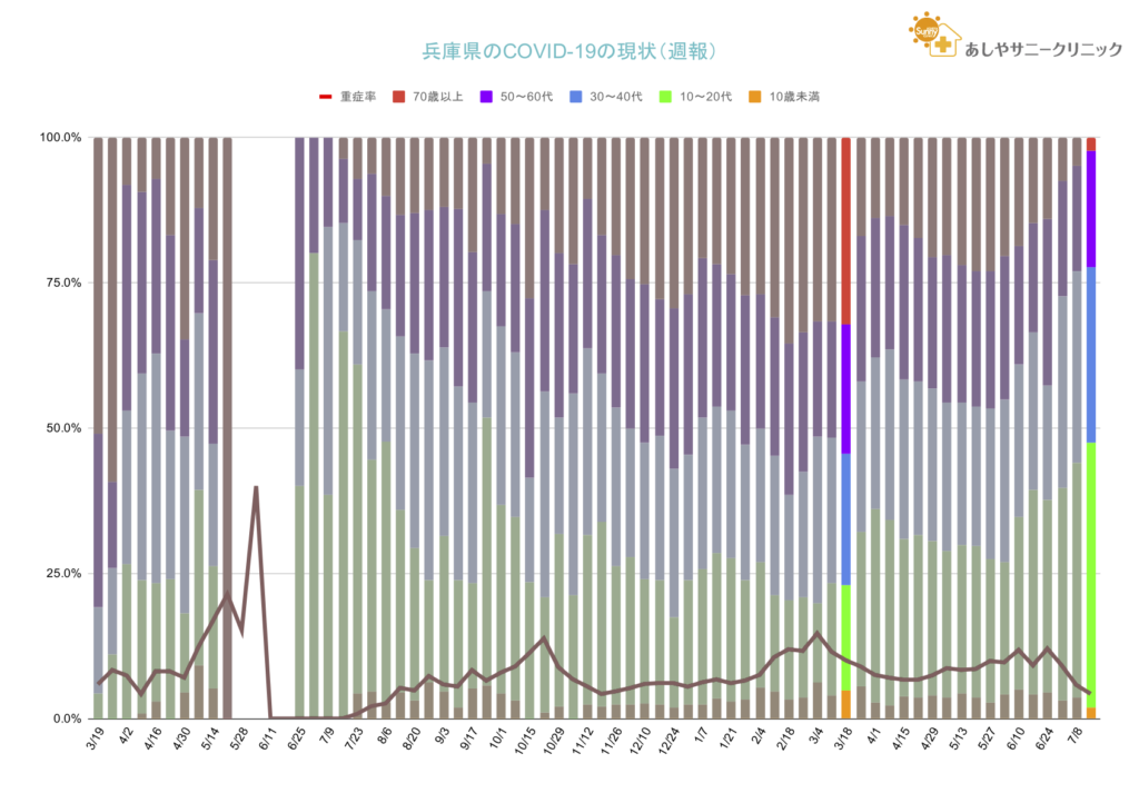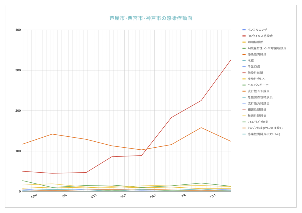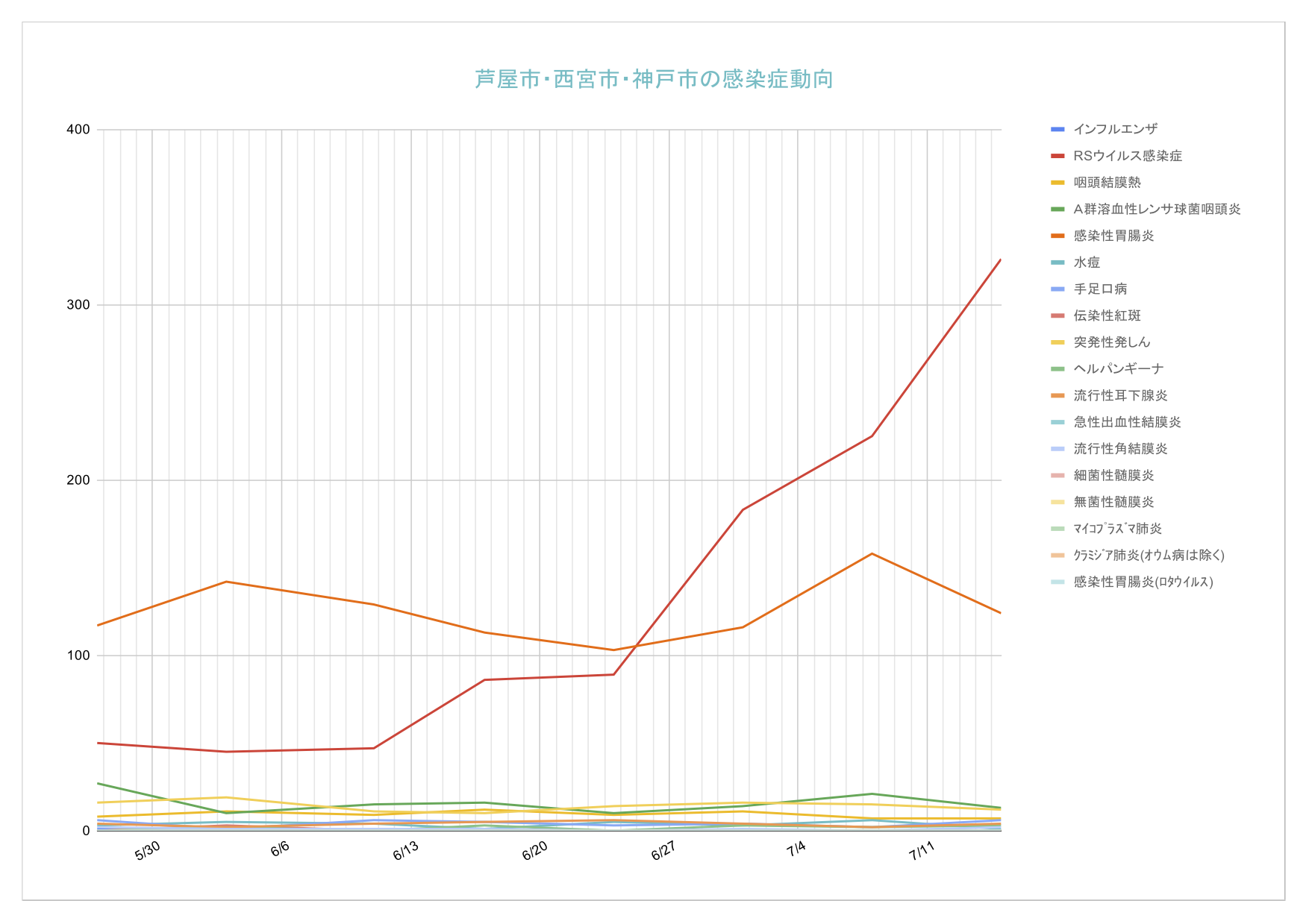 兵庫県感染症情報センターからリリースされている週報から芦屋市・西宮市・神戸市の情報をピックアップして集計したものと、兵庫県のCOVID-19関連のデータを集計したものを配信しています。