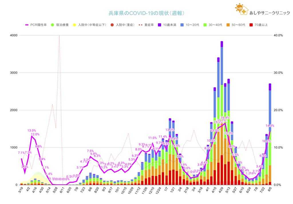 PCR検査の新規陽性者数はこの1週間(7/29から8/5)で⊿+180人と上昇傾向がさらに強まっています。