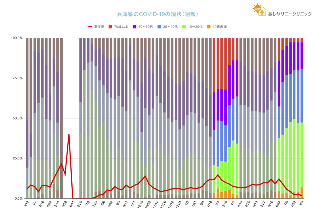第5波の特徴として70歳以上が非常に少ないこと、10〜20代が特に多いこと、重症率が低いことが挙げられそうです。