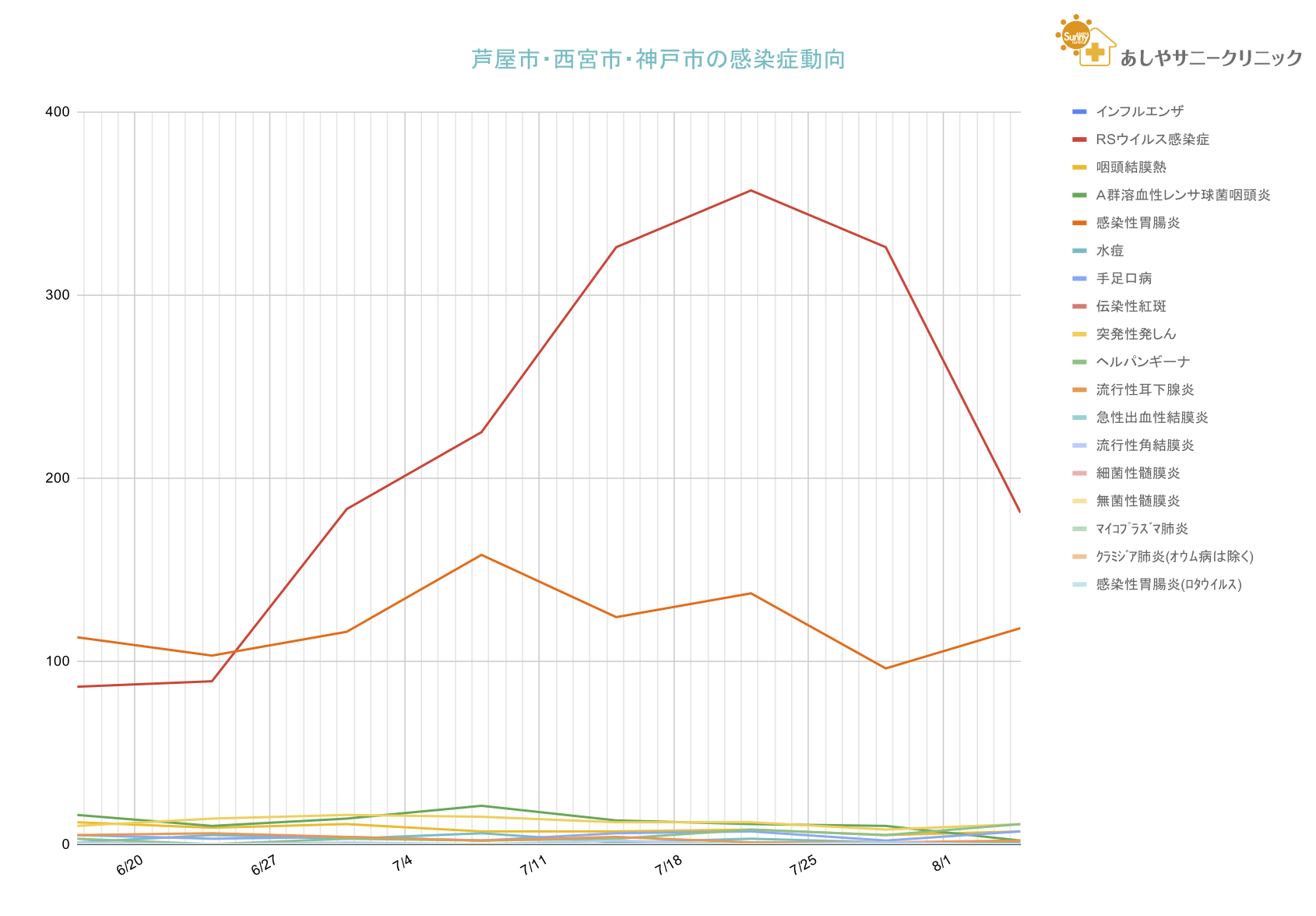 グラフの縦軸が圧縮されておりわかりにくいのですが、ヘルパンギーナの報告数が上昇傾向です。喉の痛みを伴う発熱にご留意下さい。