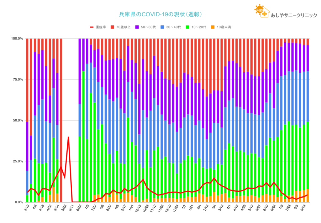 第5波の特徴として70歳以上が非常に少ないこと、10〜20代が特に多いこと、重症率が低いことが挙げられそうですが、ここ数週間の傾向として
