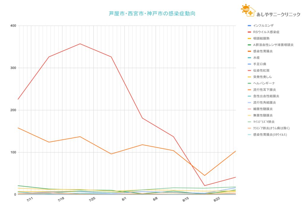 RSウイルスが多かったため縦軸が圧縮されてわかりにくのですが、手足口病・ヘルパンギーナのエンテロウイルス感染症が増加傾向です。