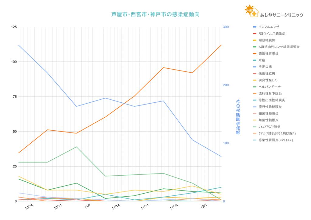 かなり多くなってきたため、他の感染症と縦軸を別(右)にしていますのでご留意下さい。