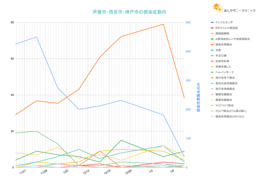 感染性胃腸炎は依然高水準ながら1週間で大幅に減少しました。