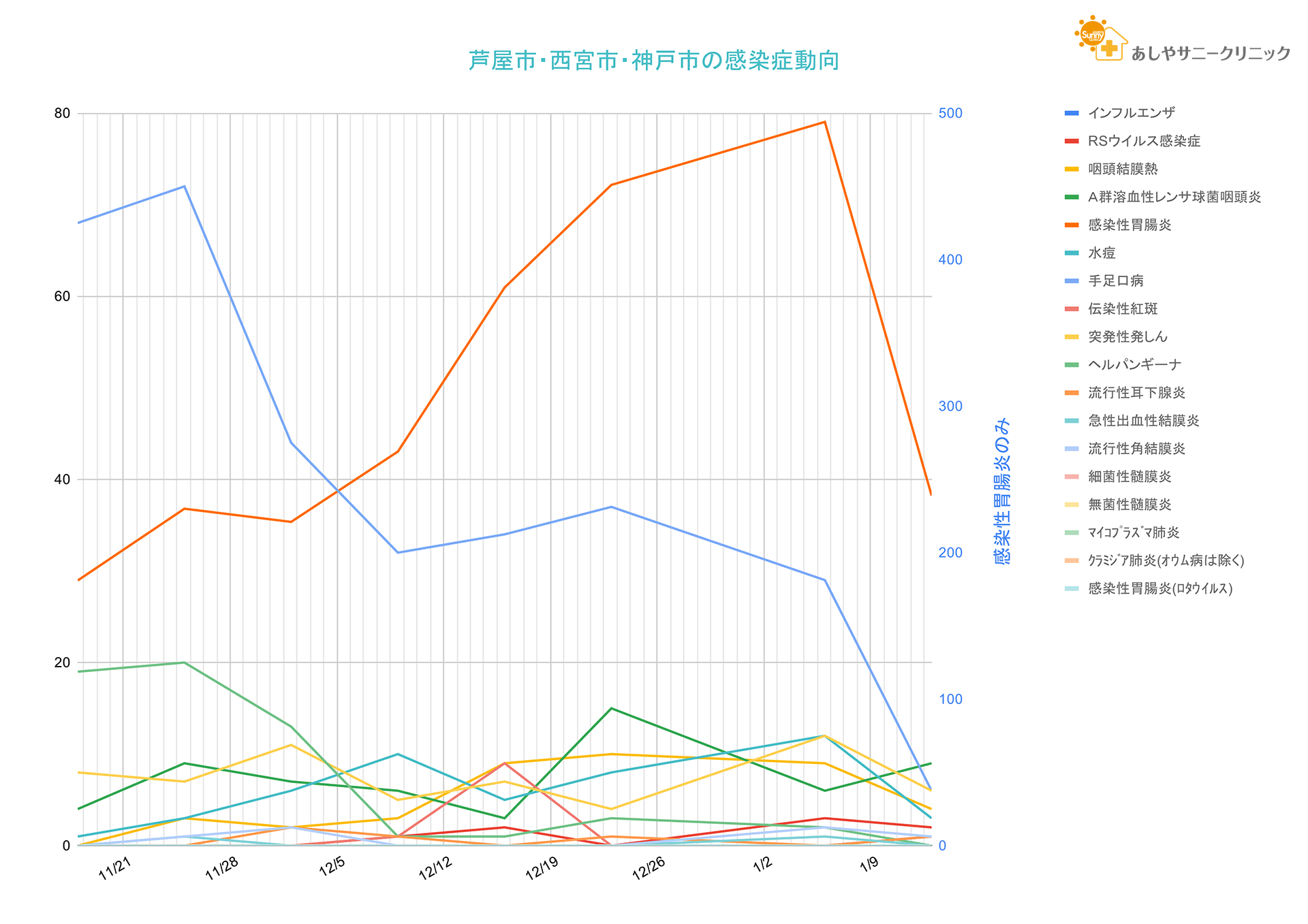 縦軸が他の感染症と別(右)にしていますのでご留意下さい。