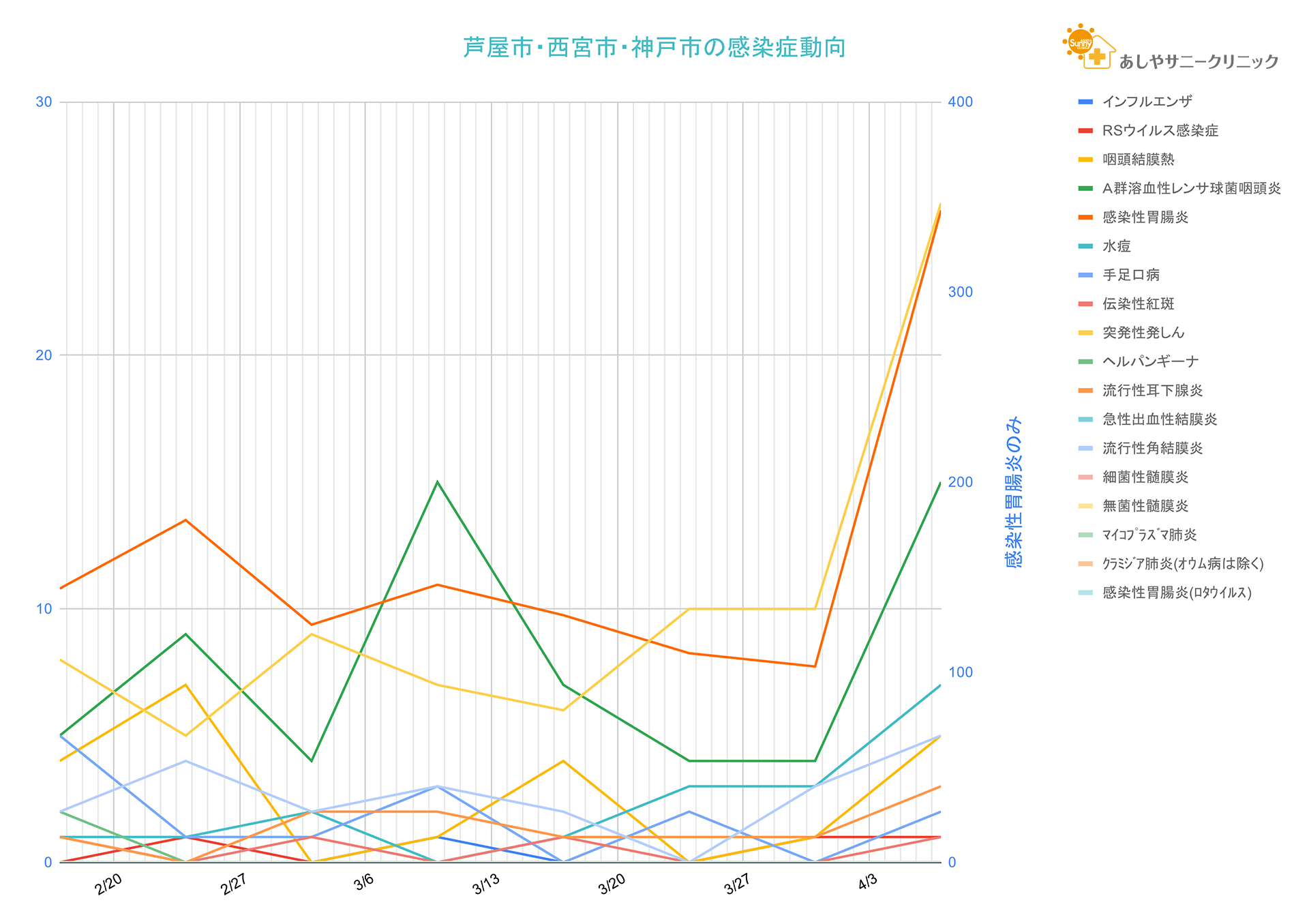 一般感染症は今週全体的に増加傾向で、特に感染性胃腸炎・突発性発疹の動向が目立つ印象です。