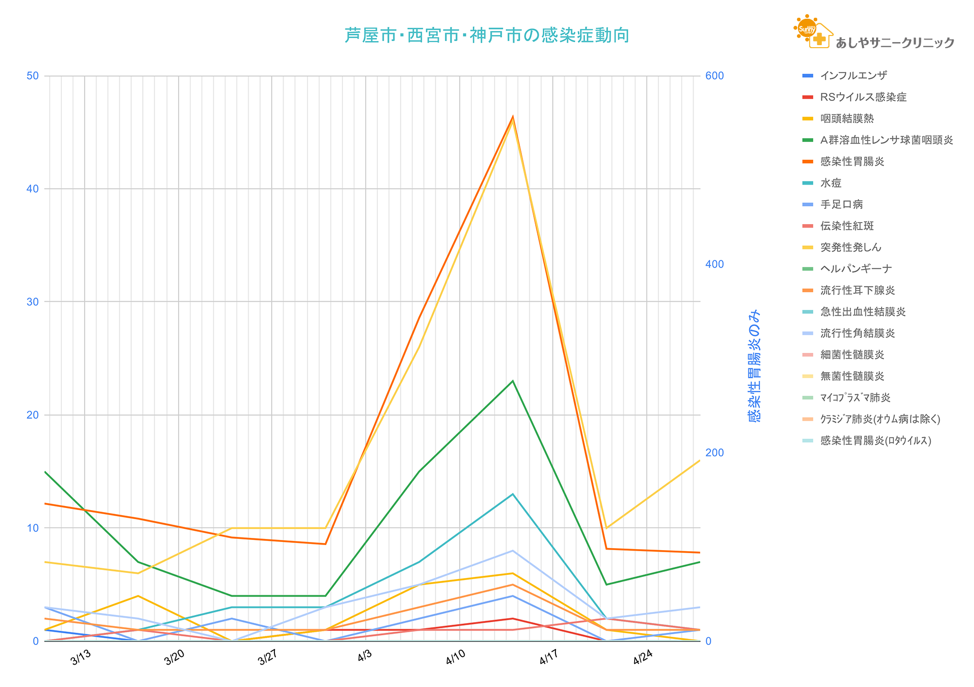 一般感染症は全体的に先週から大きな変化がありませんが、8週間で見ると感染性胃腸炎は漸増しているように思われます。