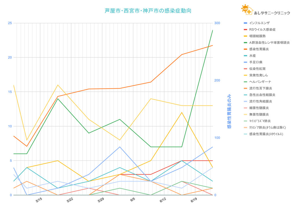 兵庫県感染症情報センターからリリースされている週報から芦屋市・西宮市・神戸市の情報をピックアップして集計したものと、兵庫県のCOVID-19関連のデータを集計したものを配信しています。
