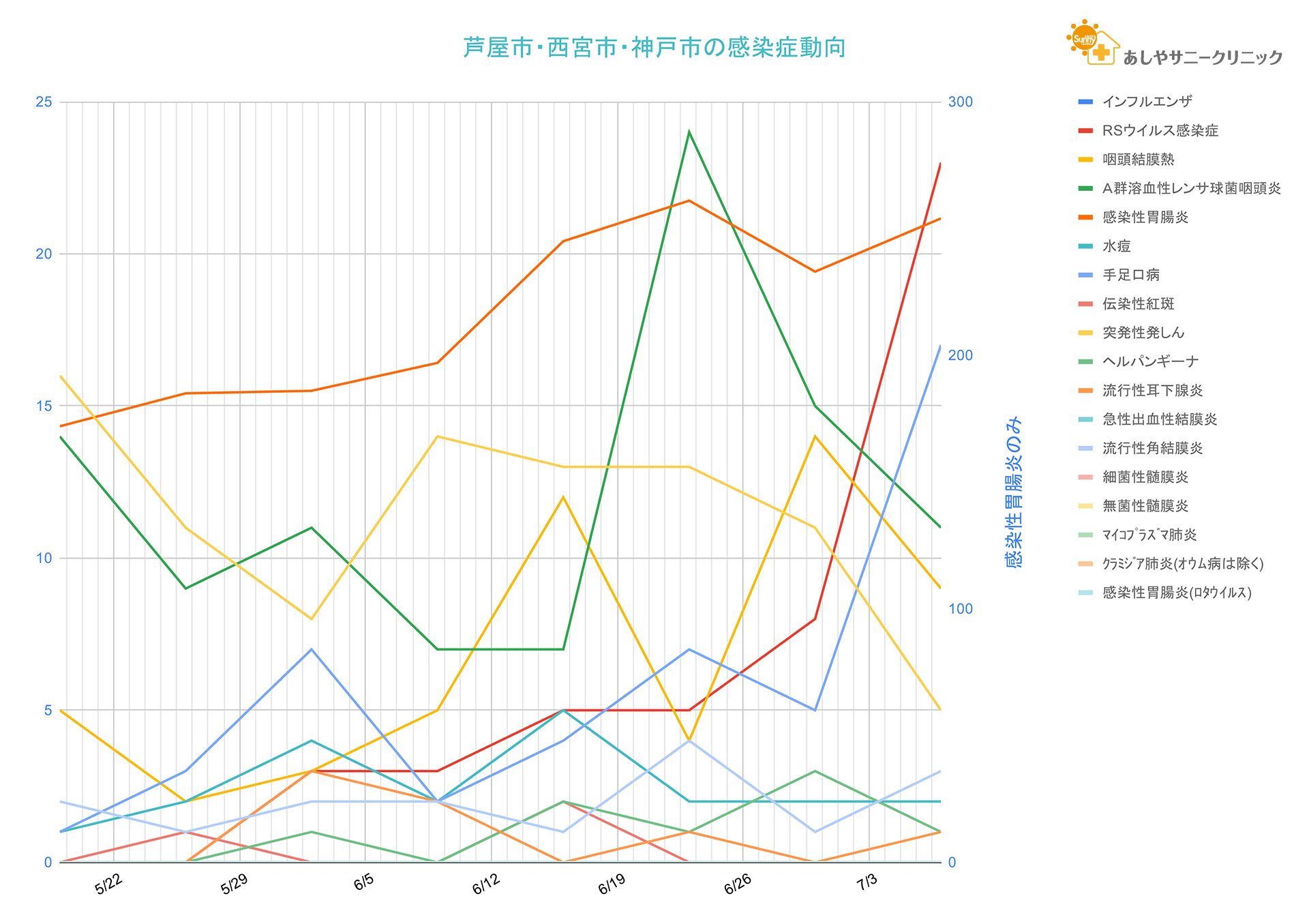 A群溶連菌性咽頭炎は2週連続で減少しており、8週間のトレンドとしては横ばいというところでしょうか。高熱+強い喉の痛みにご注意ください。