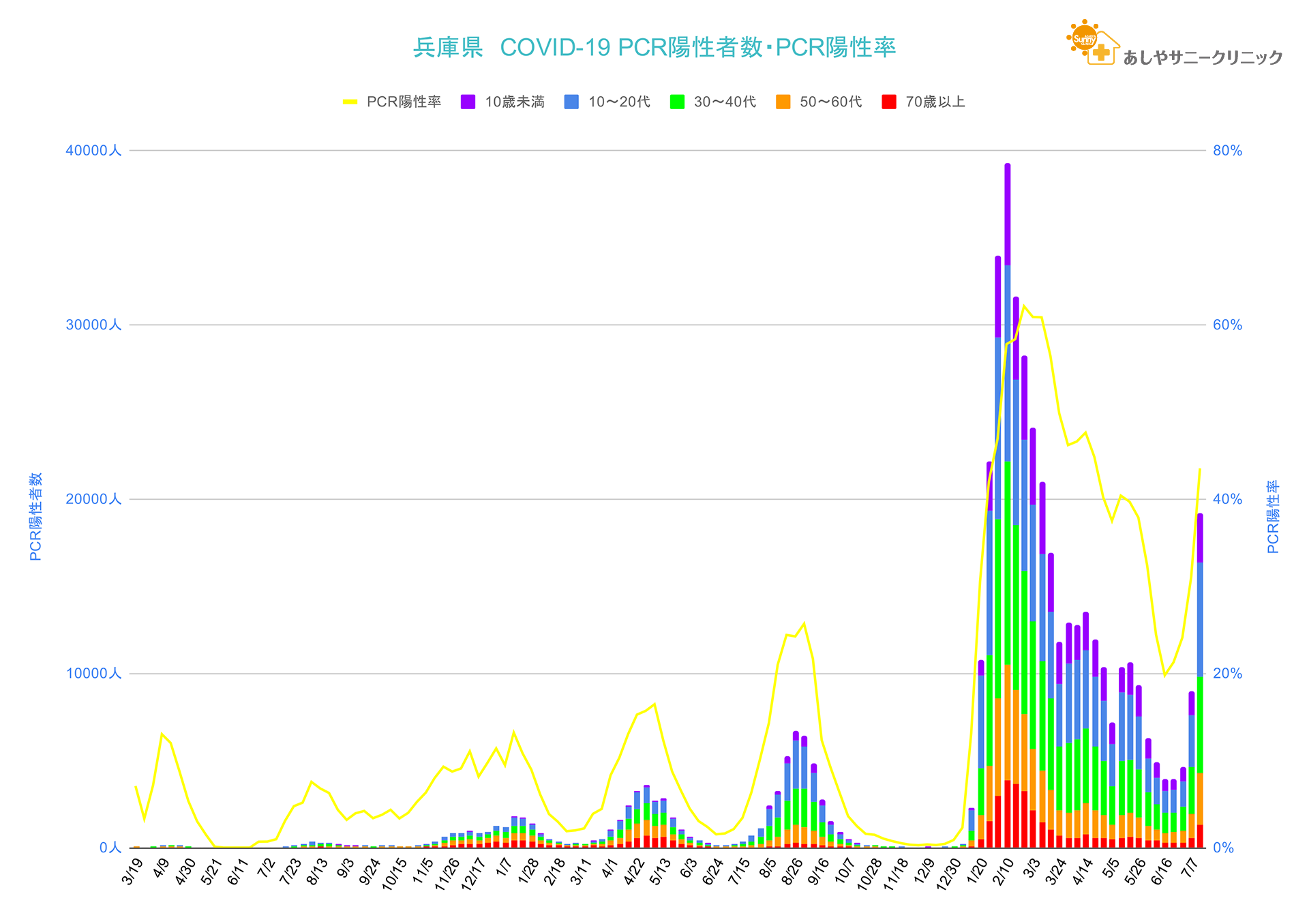 PCR陽性者数は先週の2.2倍と急増中です。PCR陽性率は約44%でした。