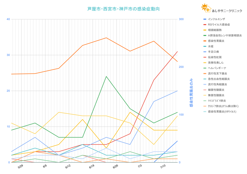 あしやサニークリニック内科は定点医療機関ではないので本報告数には含まれませんが、当クリニックでも最近の発生を把握しています。
