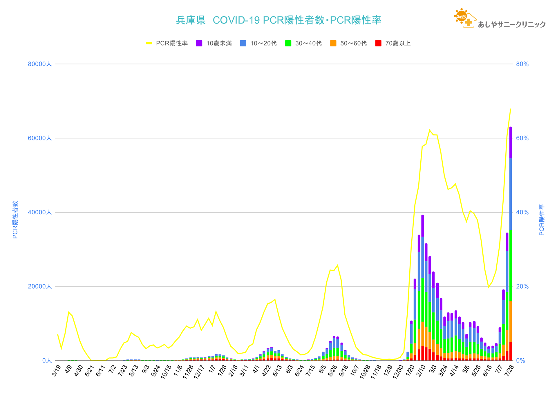 SARS-CoV-2検査陽性者数は先週の1.8倍と勢いが鈍る こと無く急増中で当エリアにおいても過去最多となり、PCR陽性率も約68%と過去最高となりました。