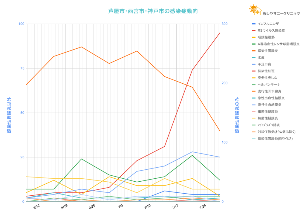 兵庫県感染症情報センターからリリースされている週報から芦屋市・西宮市・神戸市の情報をピックアップして集計したものと、兵庫県のCOVID-19関連のデータを集計したものを配信しています。