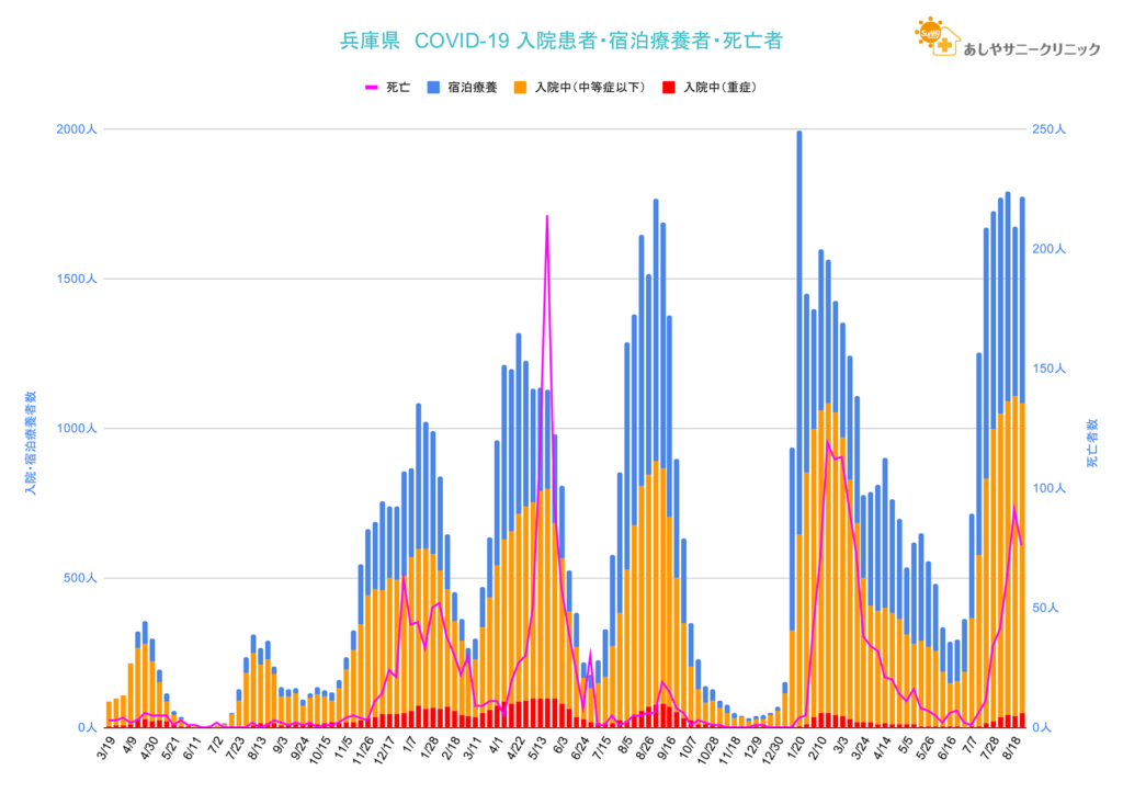 入院患者数・宿泊療養者数、そして死亡者数のグラフです。