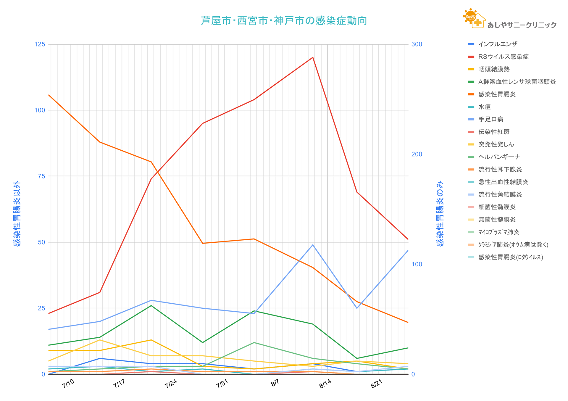 報告数は今週辺りまでお盆の影響がありそうですが、それでも手足口病を除いて特段の留意点はなさそうな印象です。