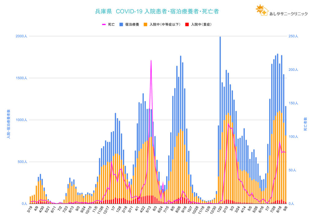 入院患者数・宿泊療養者数、そして死亡者数のグラフです。