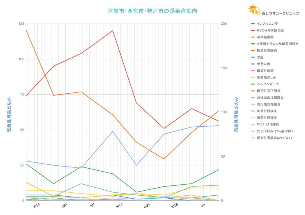 兵庫県感染症情報センターからリリースされている週報から芦屋市・西宮市・神戸市の情報をピックアップして集計したものと、兵庫県のCOVID-19関連のデータを集計したものを配信しています。