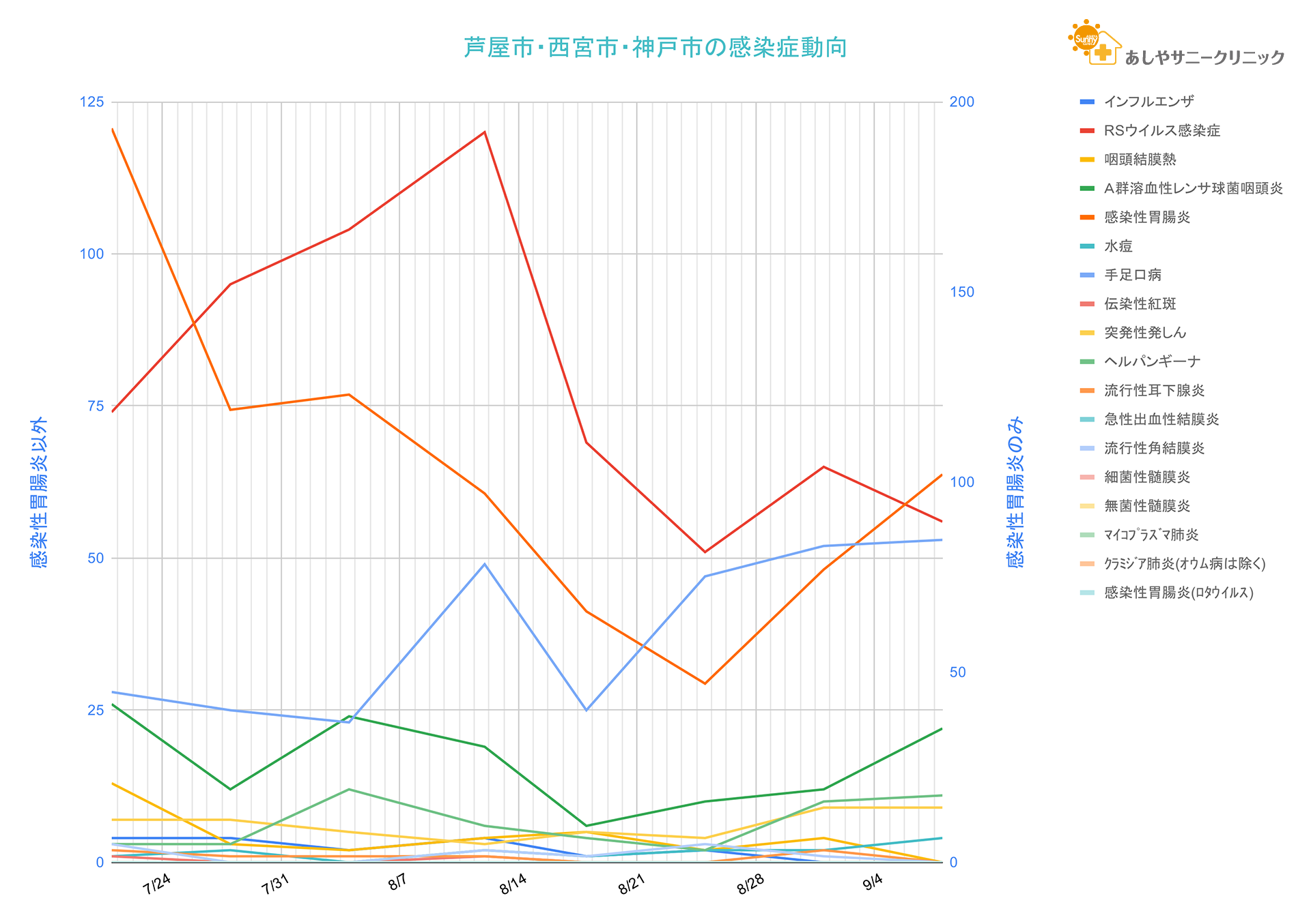 感染性胃腸炎が2週連続で比較的大きな幅で上昇中です。