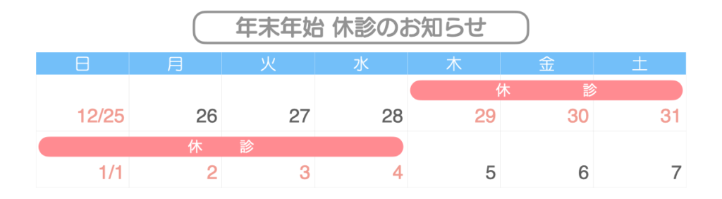 あしやサニークリニック内科は下記の通り年末年始の休診をさせて頂きます。
