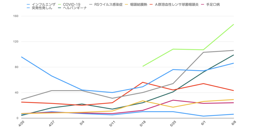 そのCOVID-19ですが、5類感染症移行後、着々と数を伸ばしており、感染性胃腸炎(グラフには載せていません)を除けば最多であるとともに急速に増加中です。