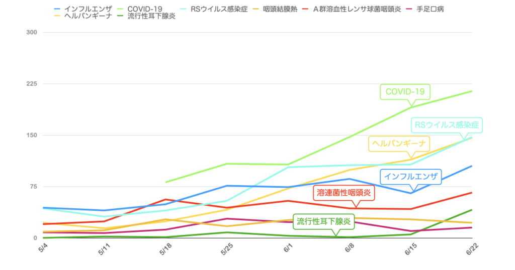 ヘルパンギーナも未だ勢いに陰りを見せることなく増加中です。少なくともこの3年では最も報告数が多くなっています。手足口病は頭打ち状態です。