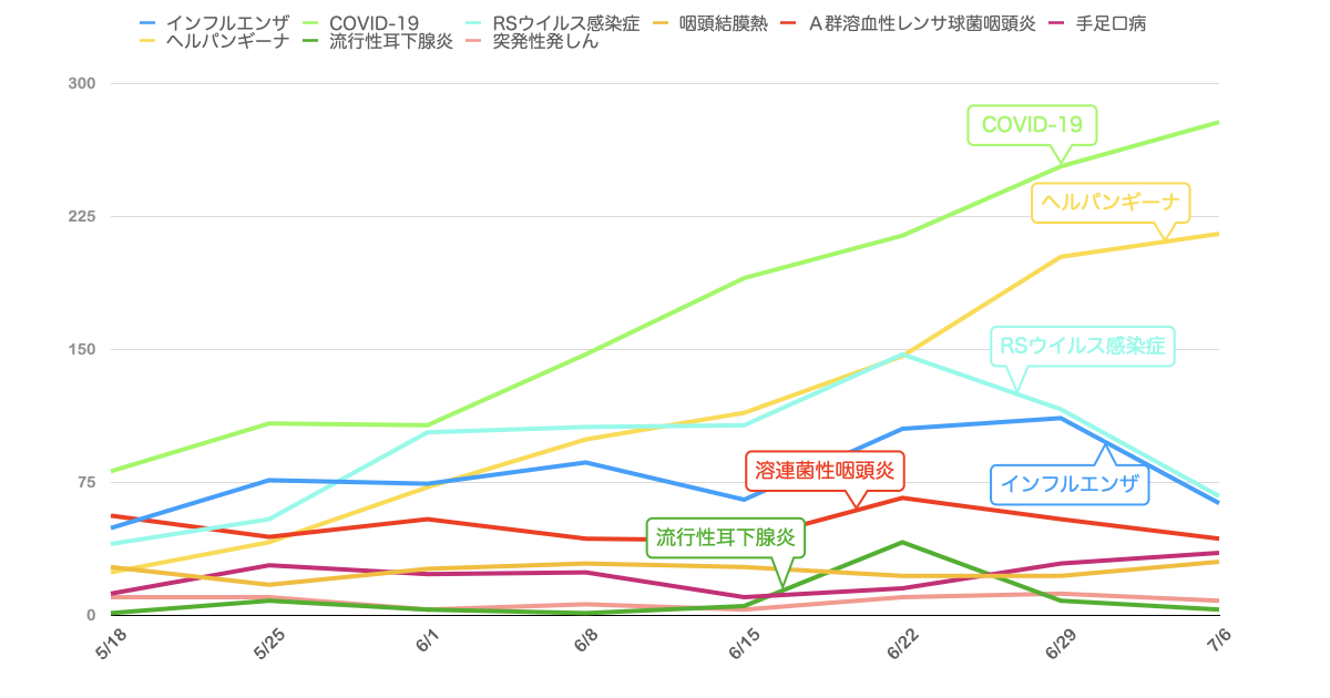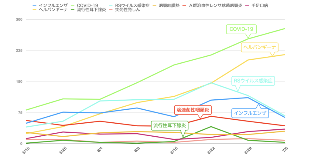 数的には流行真っ只中のCOVID-19の8割弱にまで達しており、方やCOVID-19が全年齢にくまなく発生するのに対して、方やヘルパンギーナはその90%が5歳以下に限られるのを鑑みると相当な勢いで拡大していると考えられます。