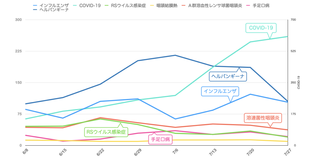 GW明けから5類感染症に移行しましたが、そのタイミングから増加しつつあり、当エリアにつきましては6/1以降増加し続けている状況です。