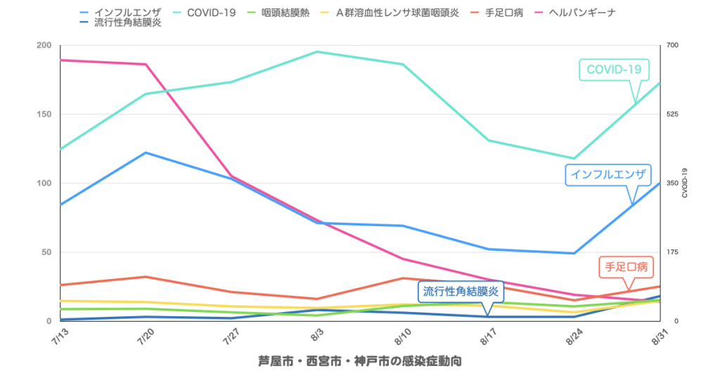 兵庫県感染症情報センターからリリースされている週報から芦屋市・西宮市・神戸市の情報をピックアップして集計したものを若干のコメントをつけて配信しています。