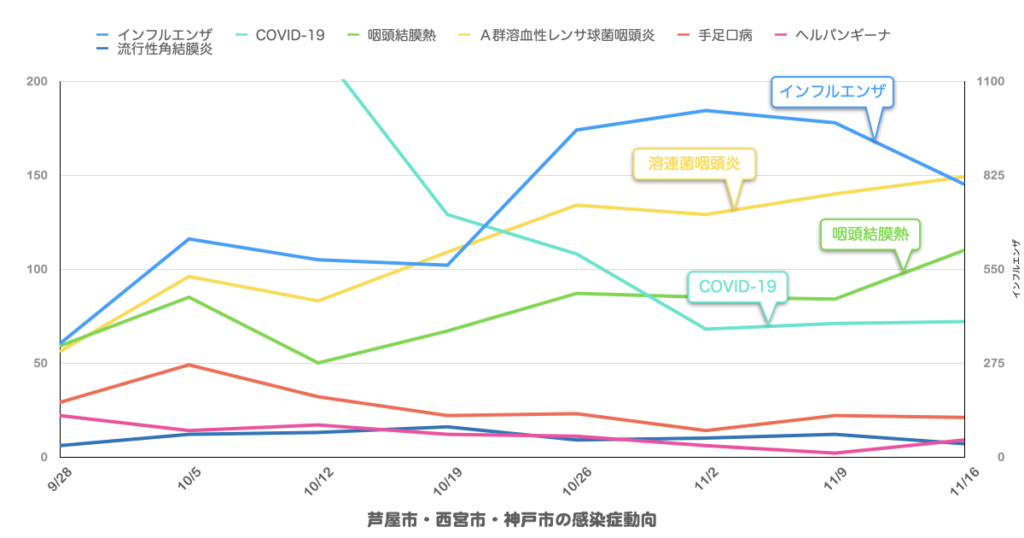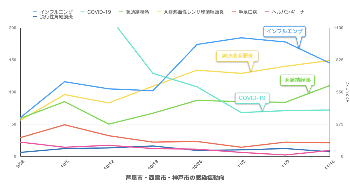 兵庫県感染症情報センターからリリースされている週報から芦屋市・西宮市・神戸市の情報をピックアップして集計したものを若干のコメントをつけて配信しています。