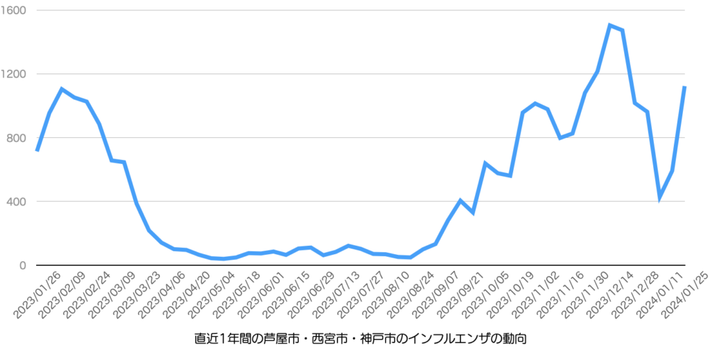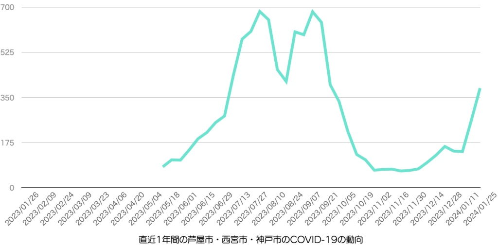 兵庫県感染症情報センターからリリースされている週報から芦屋市・西宮市・神戸市の情報をピックアップして集計したものを若干のコメントをつけて配信しています。