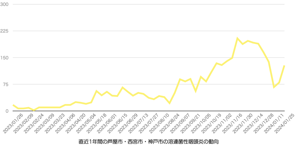 下図は直近1年間の溶連菌性咽頭炎の動向です。