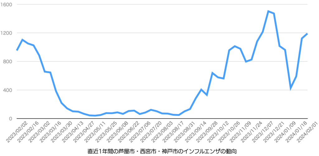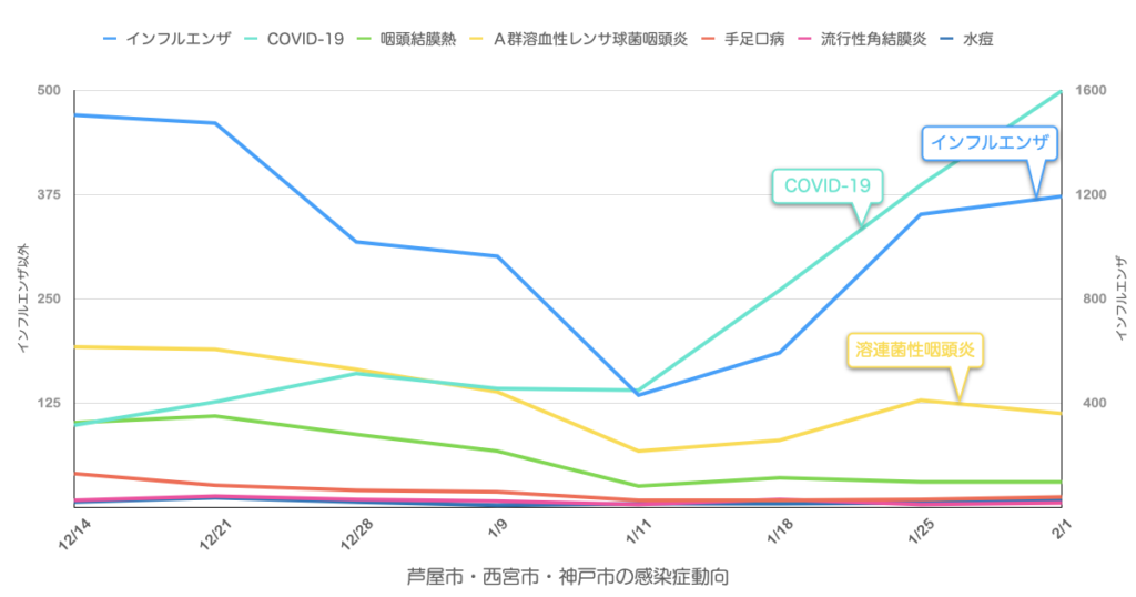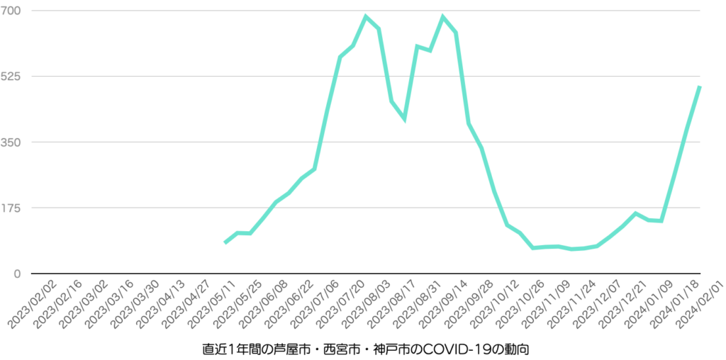 兵庫県感染症情報センターからリリースされている週報から芦屋市・西宮市・神戸市の情報をピックアップして集計したものを若干のコメントをつけて配信しています。