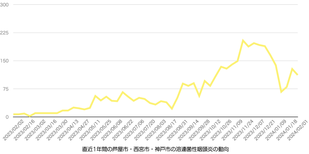 下図は直近1年間の溶連菌性咽頭炎の動向です。
