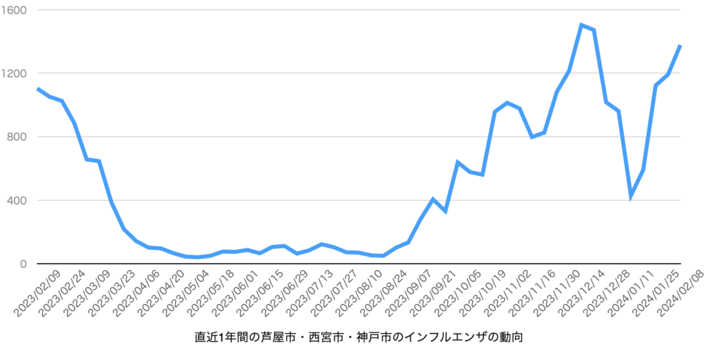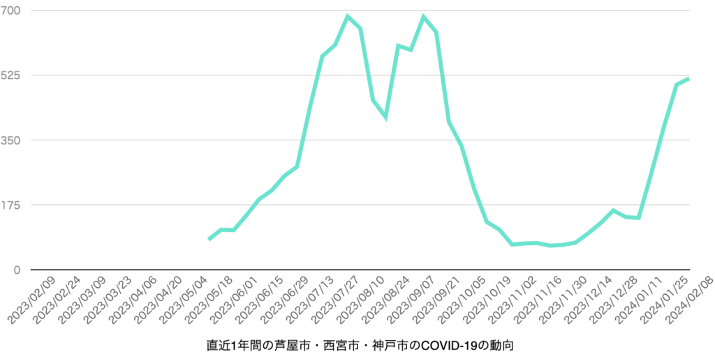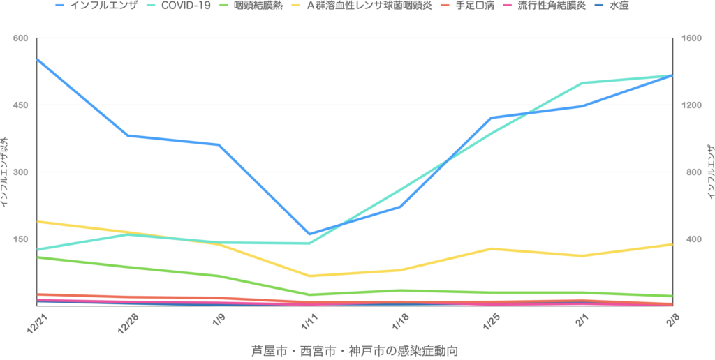 兵庫県感染症情報センターからリリースされている週報から芦屋市・西宮市・神戸市の情報をピックアップして集計したものを若干のコメントをつけて配信しています。