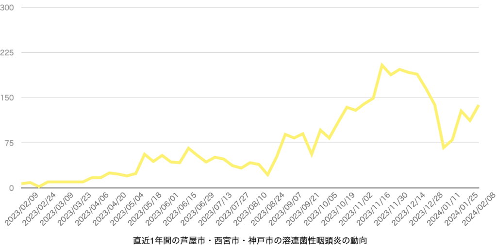 下図は直近1年間の溶連菌性咽頭炎の動向です。