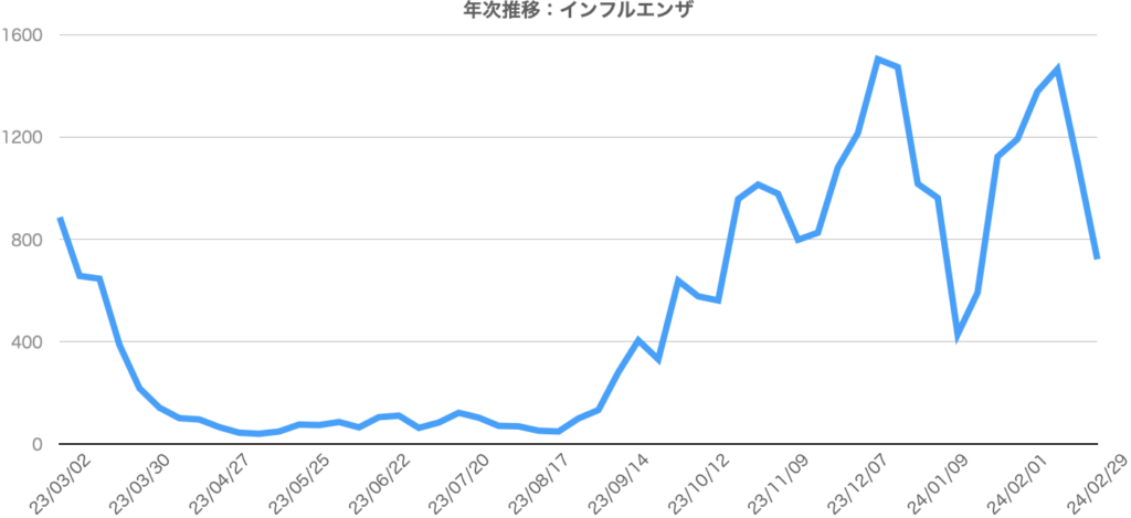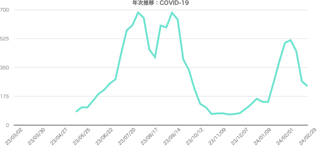 2023年5月に5類感染症になったのに伴い定点観測に移行したためグラフは同時期からのものとなります。