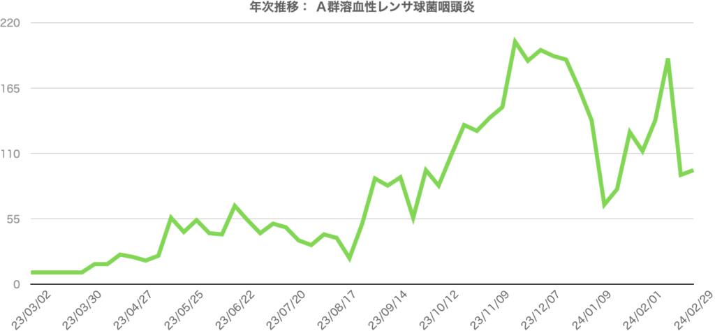 下のグラフは溶連菌性咽頭炎の直近1年間の動向です。
