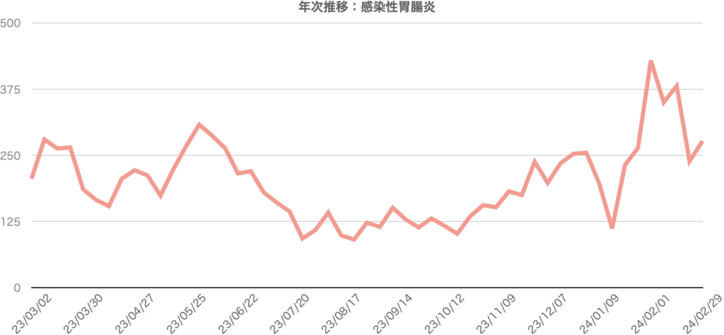 下のグラフは感染性胃腸炎の直近1年間の動向です。