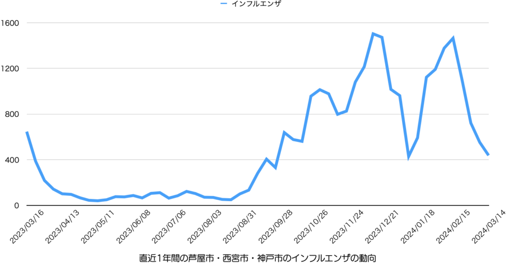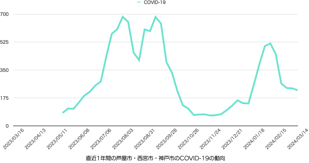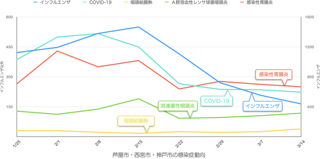 兵庫県感染症情報センターからリリースされている週報から芦屋市・西宮市・神戸市の情報をピックアップして集計したものを若干のコメントをつけて配信しています。