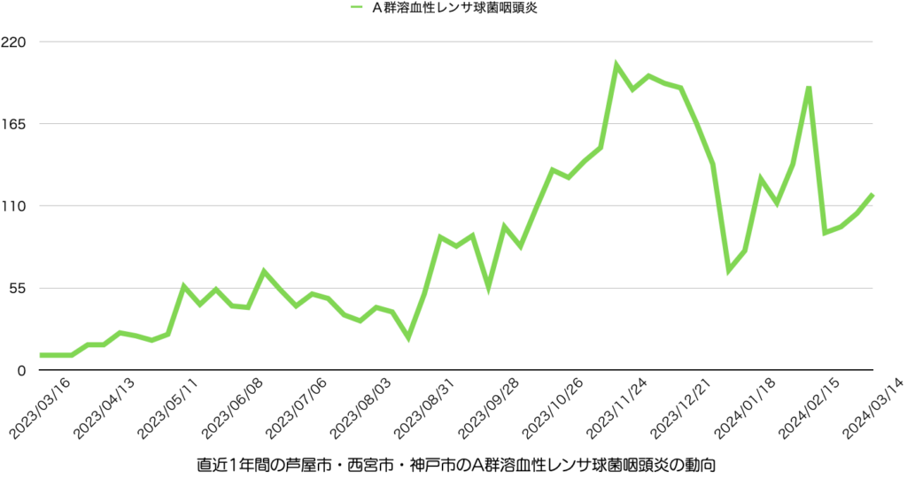 下のグラフは溶連菌性咽頭炎の直近1年間の動向です。